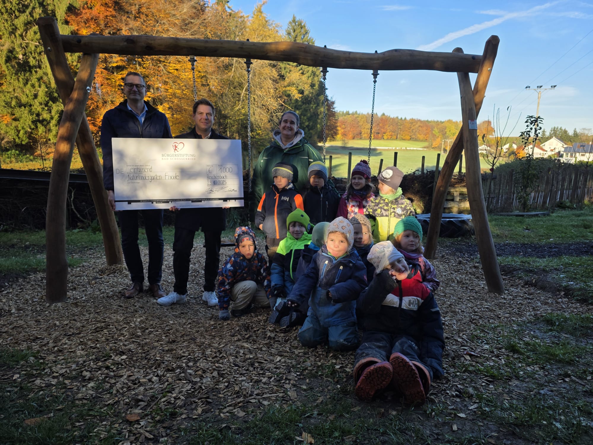 Die Stiftung beteiligte sich an der Anschaffung einer neuen Schaukel für den Naturkindergarten FIXXLE, da das gesamte Gremium diese Sinneserfahrung für die Kinder möglich machen wollte und somit zeitgleich die Entwicklung der Kinder unterstützen kann. Die Freude ist daher groß, als ein dicker Scheck von der Bürgerstiftung an den Kindergarten überreicht wird.